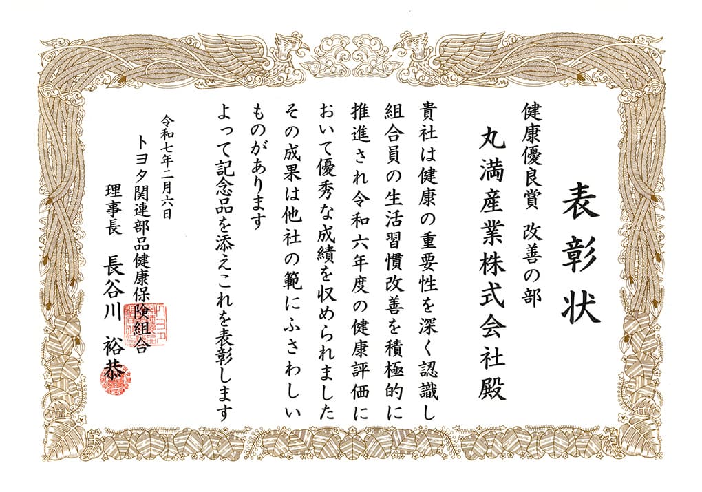 2025.02.06 | トヨタ関連部品健康保険組合から「健康優良賞 改善の部」を受賞しました。 |